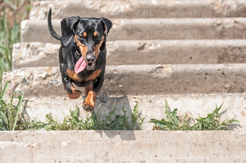 Темно-коричневая такса бегает и играет в летнем парке