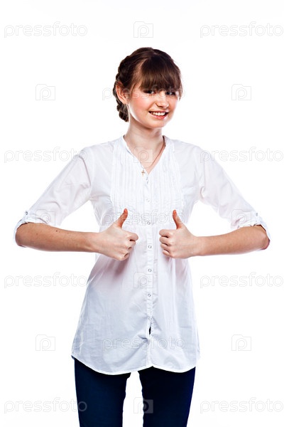 Забавная девушка в белой рубашке и темно-синих джинсах