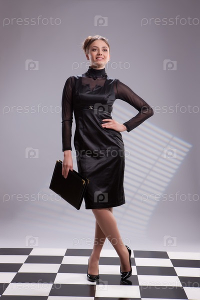 Молодая красивая женщина в модной одежде стоит на клетчатом полу