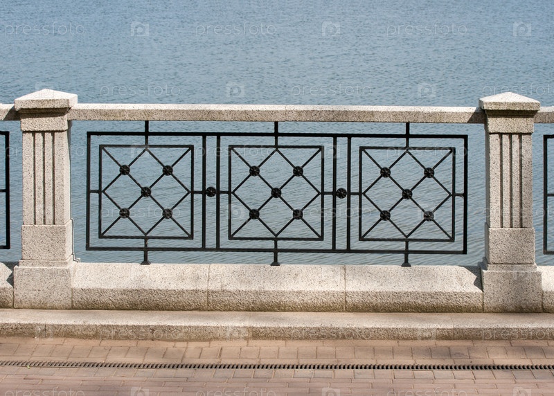 Фрагмент гранитного и металлического ограждения на городской набережной летом