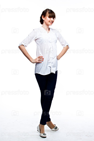 Забавная девушка в белой рубашке и темно-синих джинсах