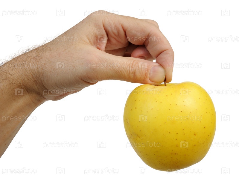 Желтое яблоко в руке на белом фоне