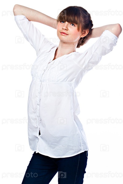 Забавная девушка в белой рубашке и темно-синих джинсах
