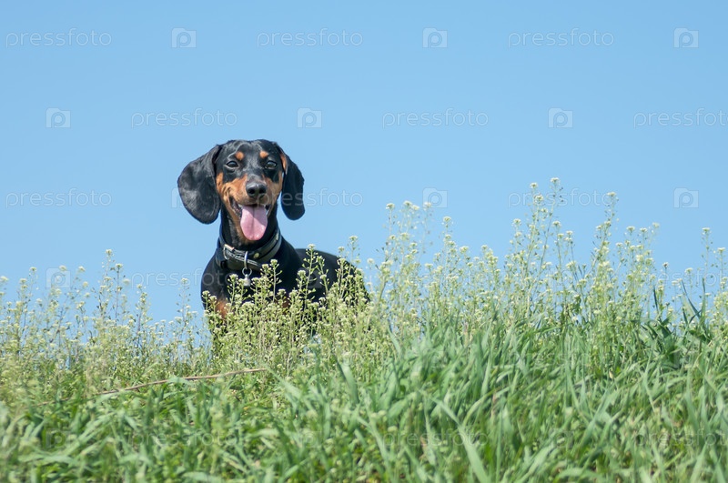 Темно-коричневая такса бегает и играет в летнем парке