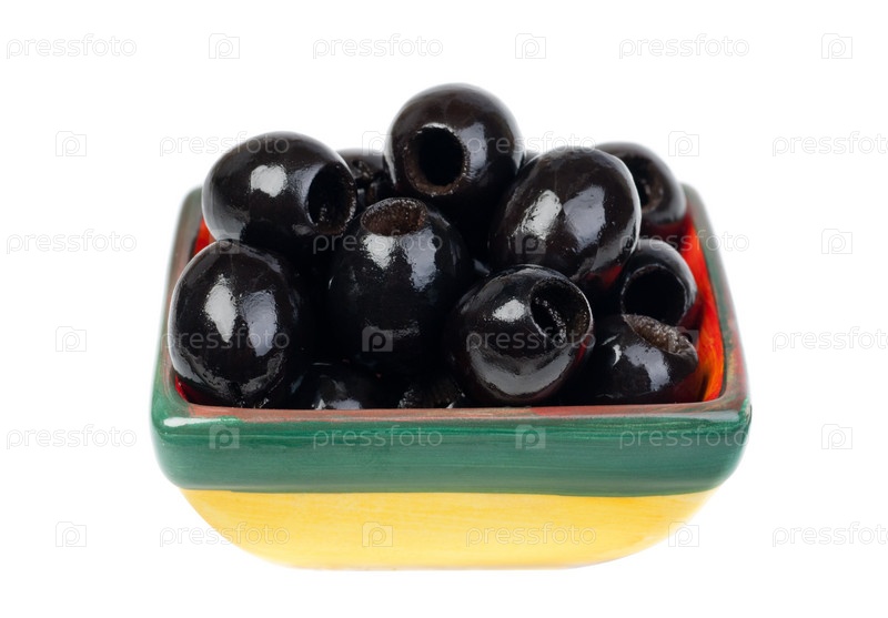 Черные оливки в цветной керамической посуде, изолированные на белом
