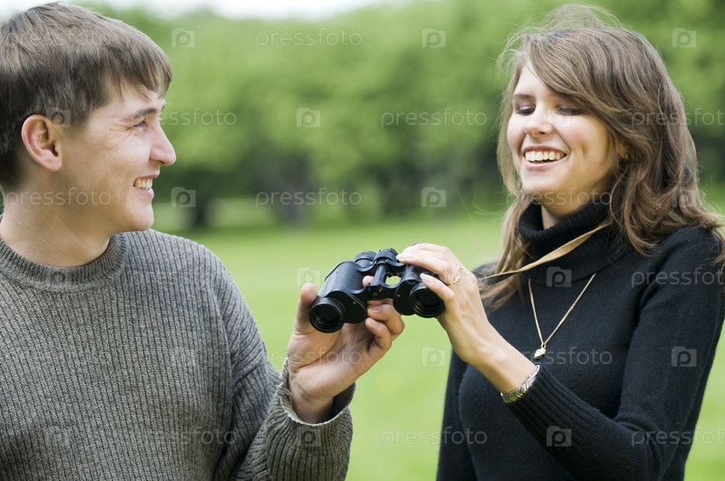 Счастливые молодые люди с биноклем