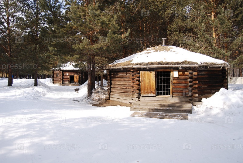 Деревянные хижины в зимнем лесу