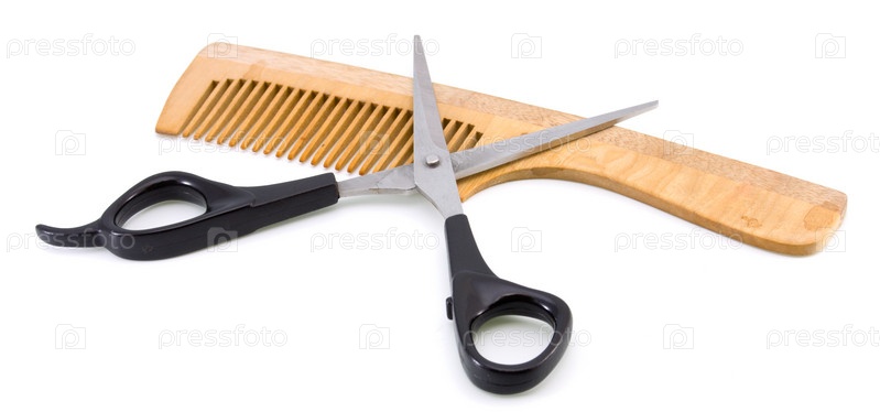 Деревянная расческа и парикмахерские ножницы на белом фоне