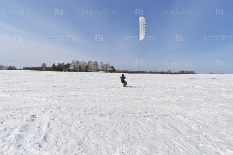 Мужчина занимается кайтингом на снегу