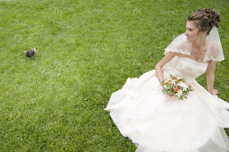 Молодая невеста сидит на лужайке и смотрит на голубя