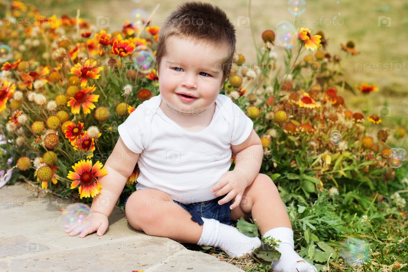 Счастливый мальчик сидит на траве в поле