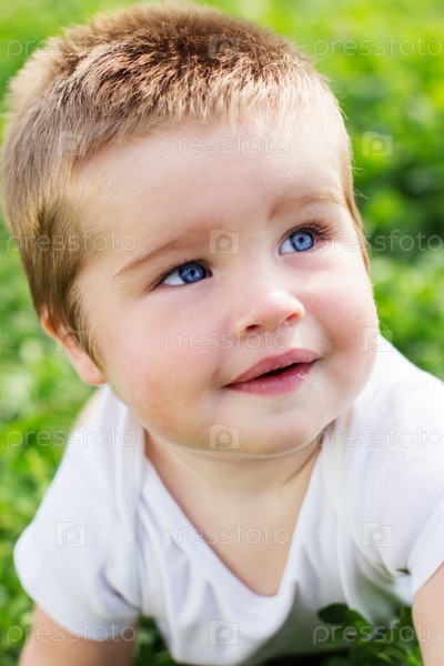 Счастливый мальчик сидит на траве в поле