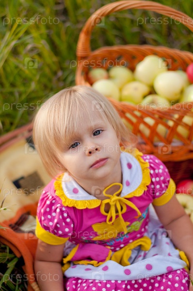 Маленькая девочка с корзиной свежих яблок