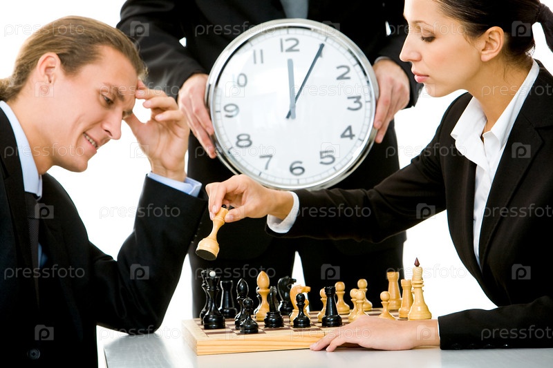 Изображение бизнесмена и деловой женщины, играющих в шахматы с бизнесменом, держащим часы на заднем плане