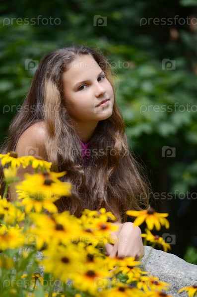 Красивая молодая брюнетка расслабляется среди желтых цветов