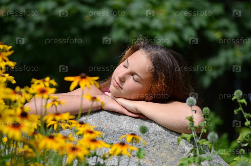 Красивая молодая брюнетка расслабляется среди желтых цветов