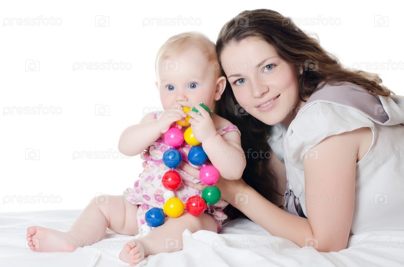 Счастливая мать с ребенком над белом фоне