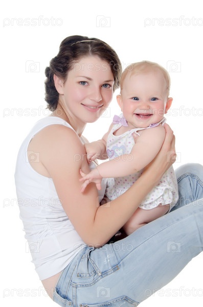 Счастливая мать с ребенком над белом фоне