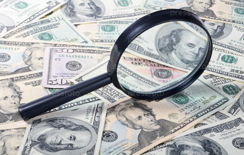 Увеличительное стекло лежит на банкнотах