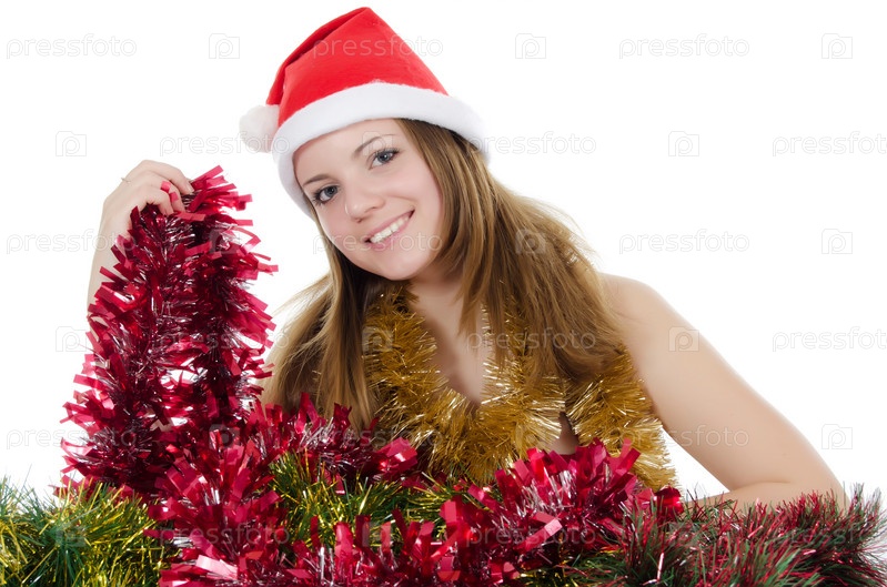 Рождественская девушка с подарками, изолированная на белом фоне