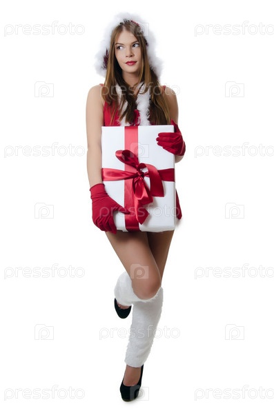 Рождественская девушка с подарками, изолированная на белом фоне