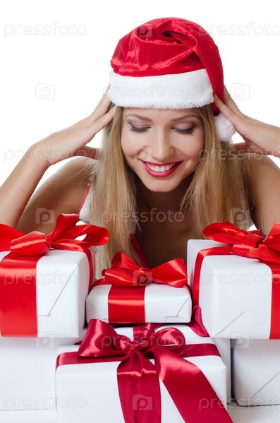 Рождественская девушка с подарками, изолированная на белом фоне