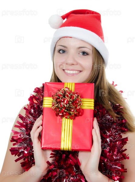 Рождественская девушка с подарками, изолированная на белом фоне