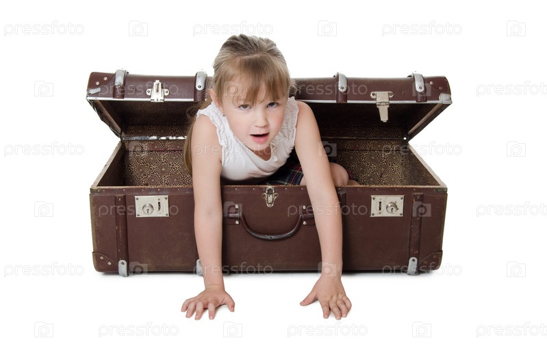 Маленькая девочка в старом чемодане, изолировано