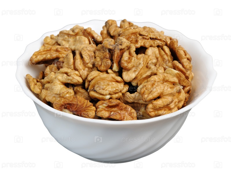Грецкие орехи в белой миске на белом фоне