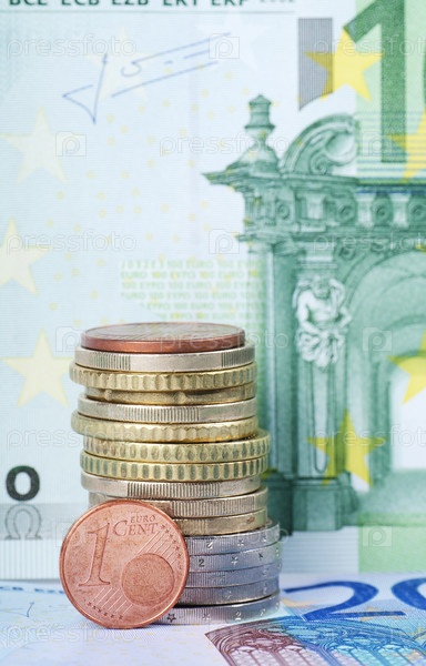 Монеты евро на фоне банкнот