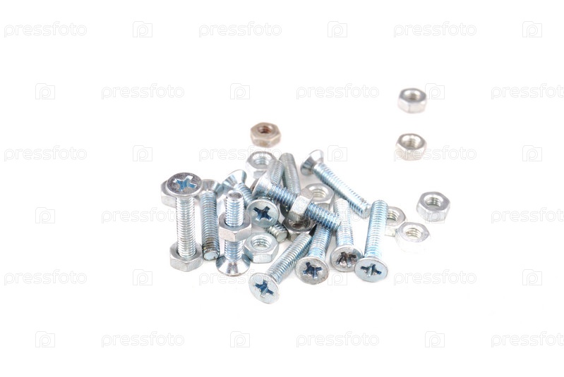 Металлические винты и инструмент для выполнения работ, на белом фоне