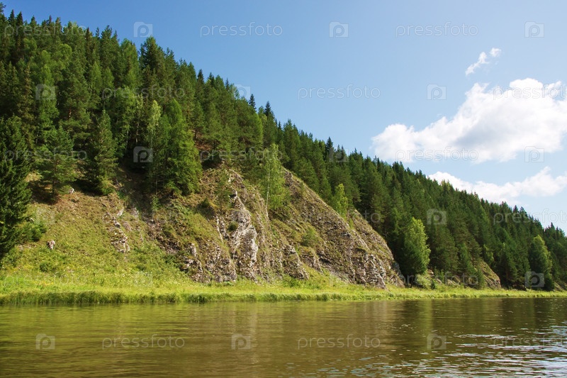 Хвойный лес на каменистом склоне у реки
