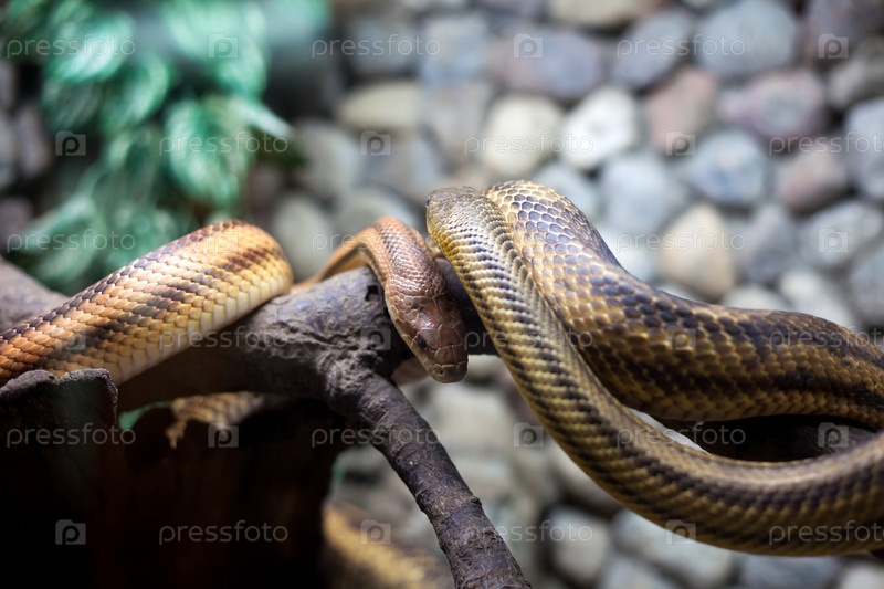 Две змеи на ветке и камнях в городском зоопарке