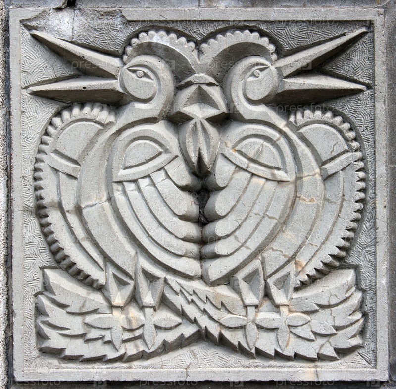 Старый барельеф с двумя сказочными птицами на стене