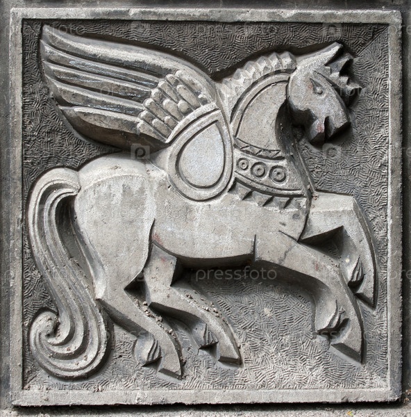 Старый барельеф со сказочным крылатым конем на стене