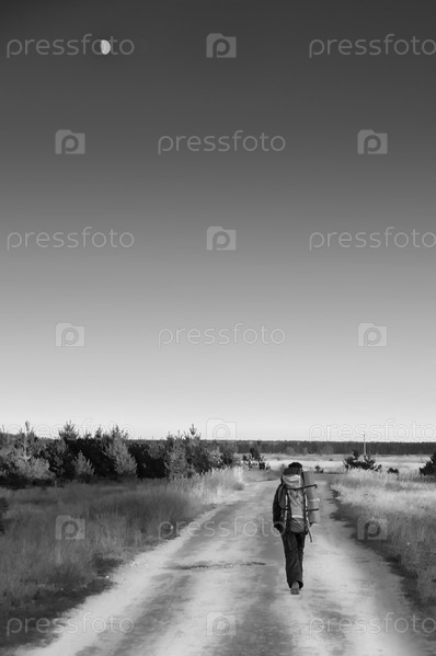Турист с рюкзаком, идущий по дороге