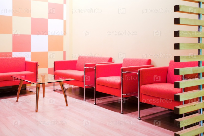 Красные стулья и стол в комнате ожидания