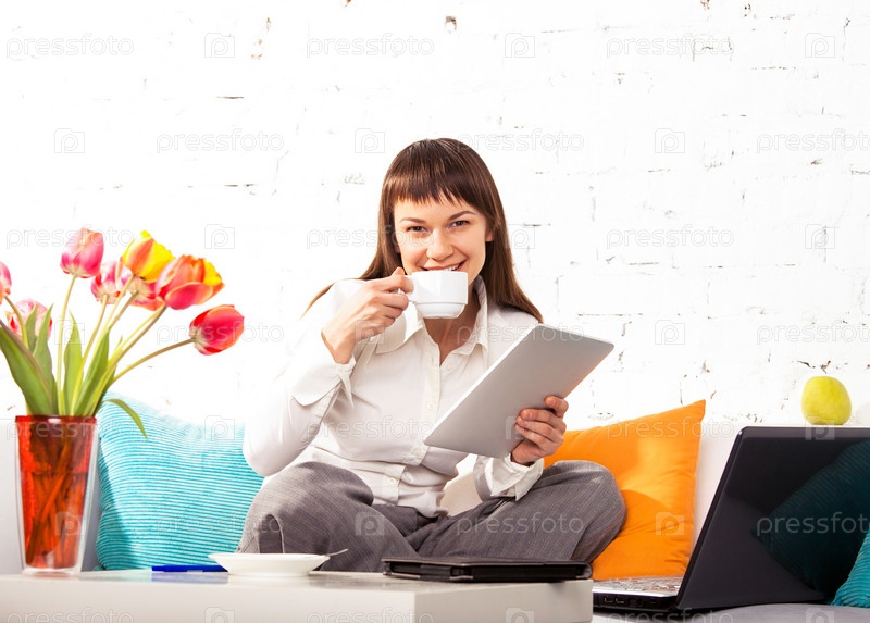 Молодая брюнетка работает на дому