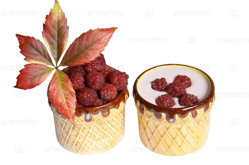 Ягоды малины и йогурт в глиняной кружке на белом фоне