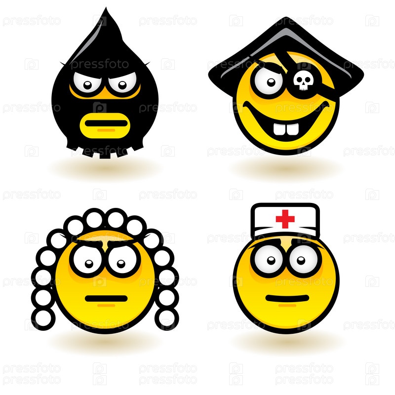 Четыре мультипликационных персонажа с разными эмоциями на белом фоне