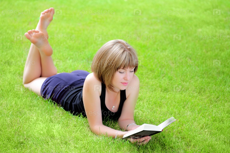 Красивая молодая женщина улыбается, лежа на траве и читая книгу