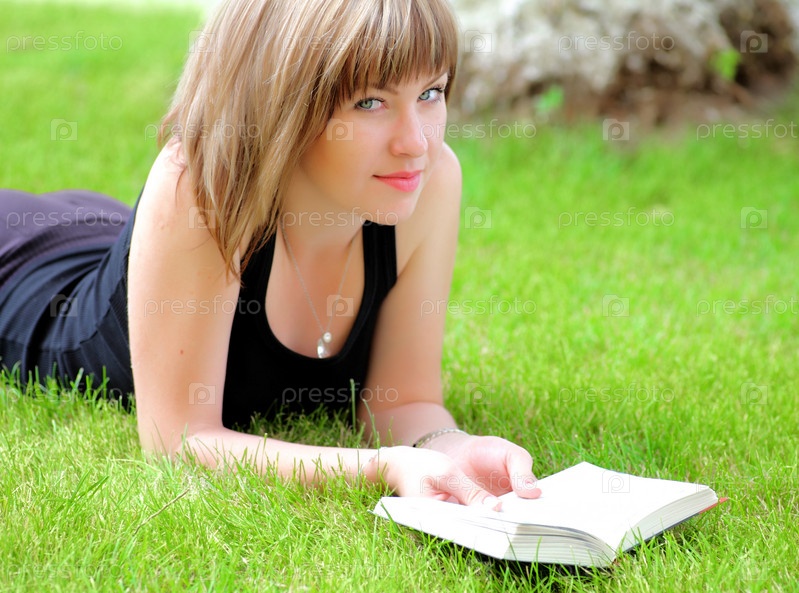 Красивая молодая женщина улыбается, лежа на траве и читая книгу