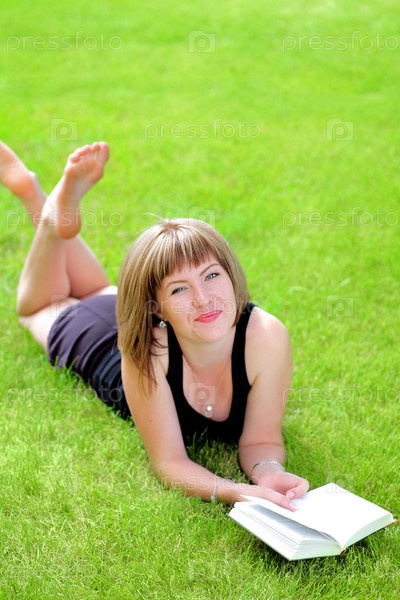 Красивая улыбающаяся женщина с книгой лежит на траве