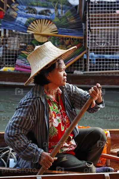 Таиланд, Бангкок, тайская женщина на своей лодке на Плавучем рынке