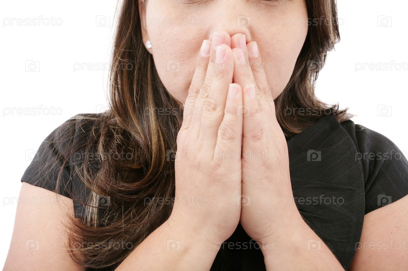 Молодая женщина молится со сложенными вместе руками на белом фоне