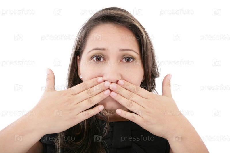Красивая молодая женщина, закрывающая лицо руками, изолированная на белом фоне