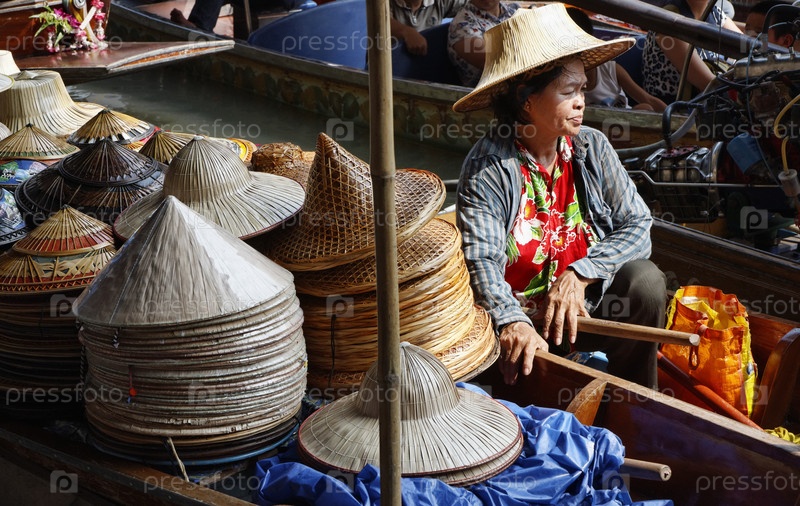 Тайская пожилая женщина продает шляпы на плавучем рынке, Банкок
