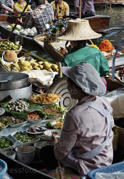 Деревянные тайские лодки с продуктами на плавучем рынке, Банкок