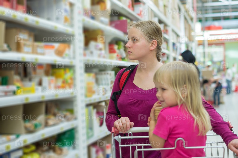 Мать и дочь делают покупки в отделе печенья в супермаркете