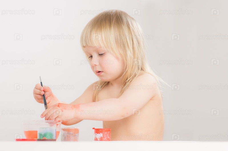 Очаровательная девочка рисует красками на бумаге, сидя на белом фоне